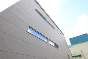 白いガルバリウムに包まれる三角屋根が特徴的な外観。
