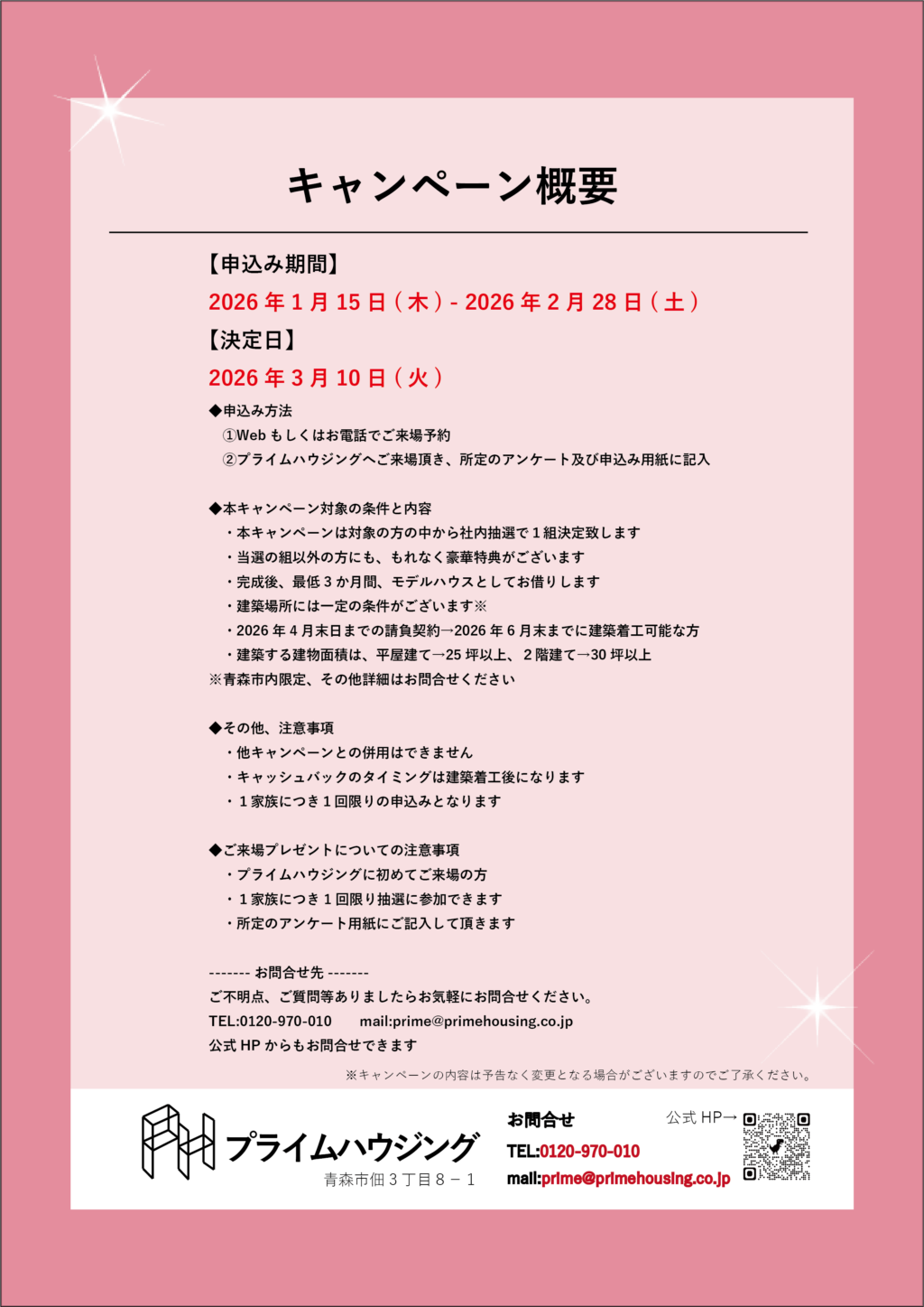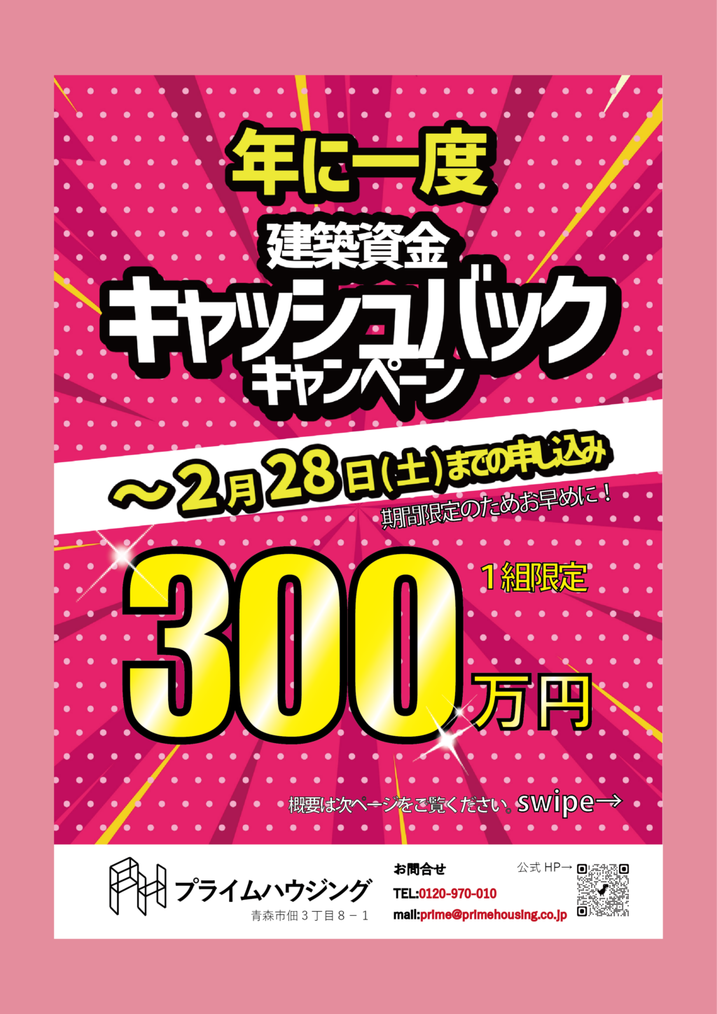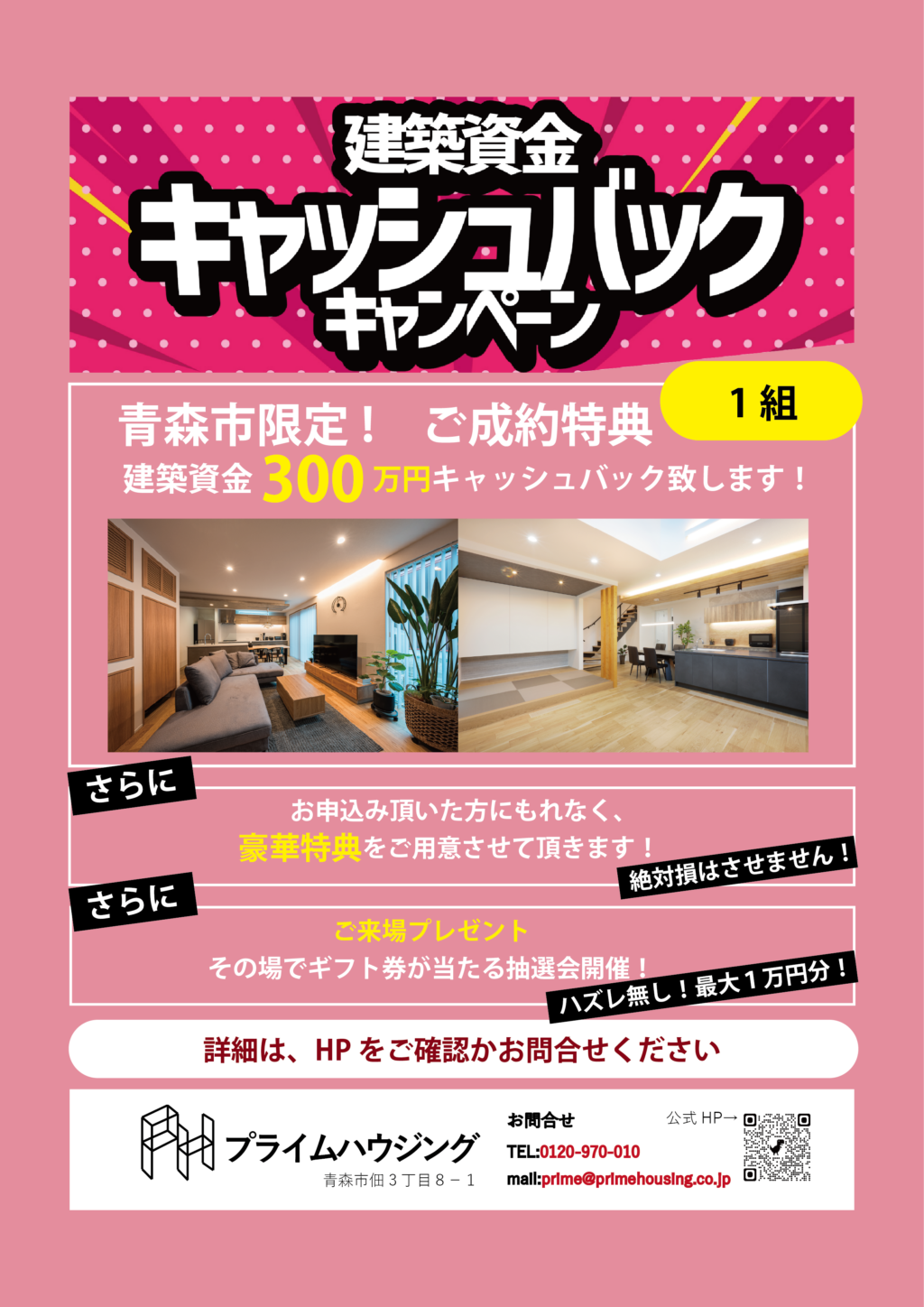 2026年1月19日 / 最終更新日時 : 2026年1月19日 primestaff ブログ 【期間限定】-建築資金キャッシュバックキャンペーン- プライムハウジングから期間限定のキャンペーンのお知らせです。 詳細内容や条件は、下部に記載がありますので必ずご確認ください。